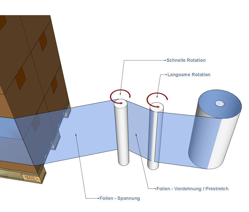 Die Vordehneinheit (Pre-Stretch) dehnt die Stretchfolie schon bevor sie um die Palette gelegt wird. Dafür läuft die Folie über Walzen, wobei ein Walzenpaar schneller zieht als das andere – so wird die Folie vorgestreckt und dann mit gleichmäßiger Spannung umwickelt.